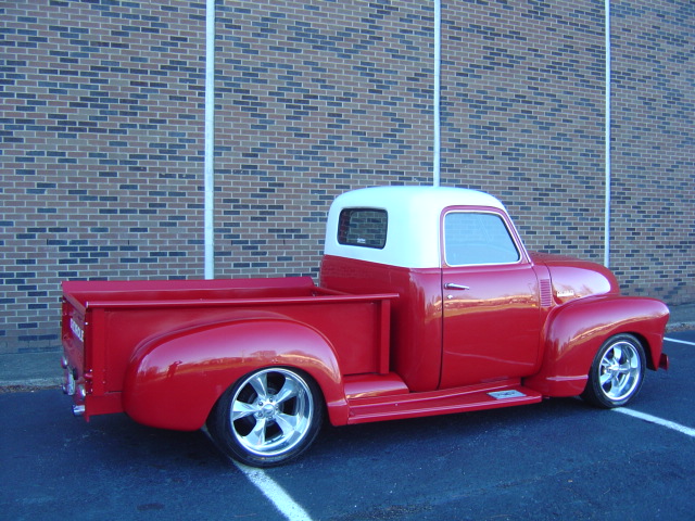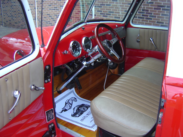GM Subframe, 350 V-8 engine, automatic transmission, power steering, power disc brakes, air conditioning, performance upgrades, chrome and aluminum accessories, headers, dual exhaust with Flowmaster mufflers, 10-bolt rear, relocated gas tank, new wiring harness, chrome tilt steering column, Lokar shifter, CD player, woodgrain steering wheel, roll pan, wheel tubs, wood bed, lowered, staggered 17" and 20" Boyd Coddington billet wheels. Stock#3434 $31,900