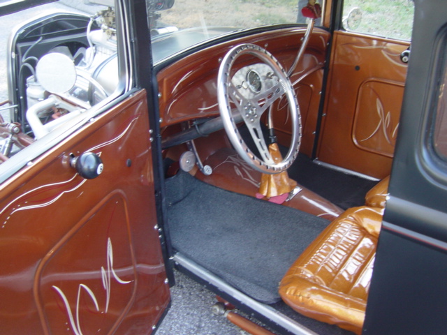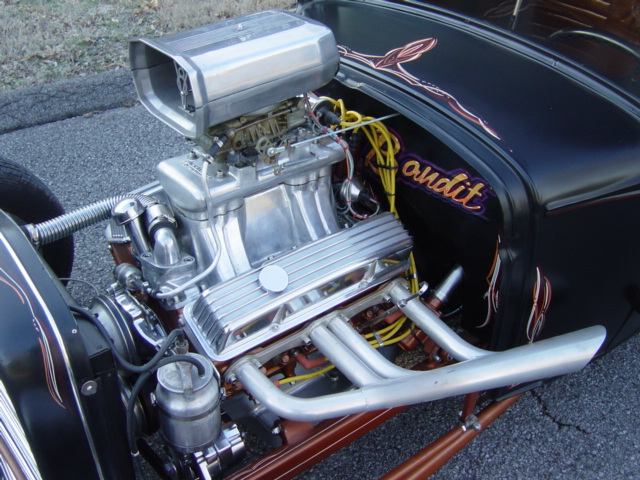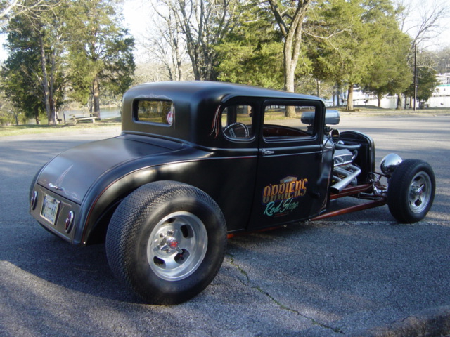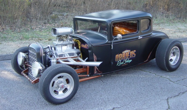 Chevrolet V-8 engine, automatic transmission, disc brakes, performance upgrades, chrome and aluminum accessories, tunnel ram with scoop, headers, chopped and channeled, custom interior, Lokar shifter, satin black paint with custom pinstriping, staggered 15" aluminum wheels. Stock#JJ3 $21,900